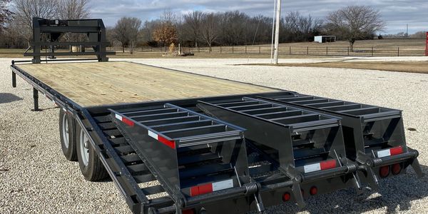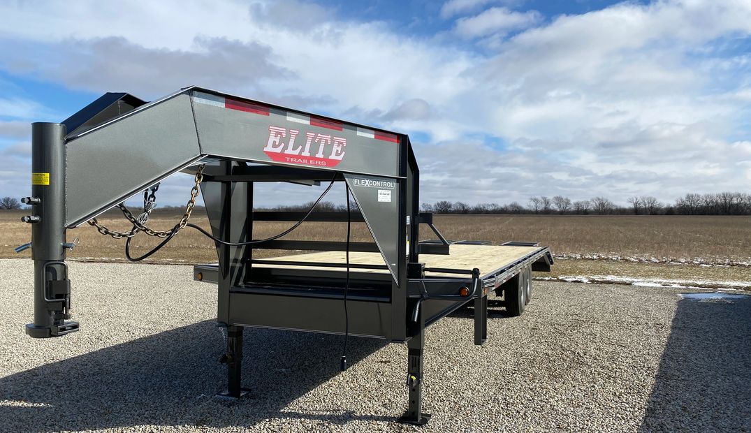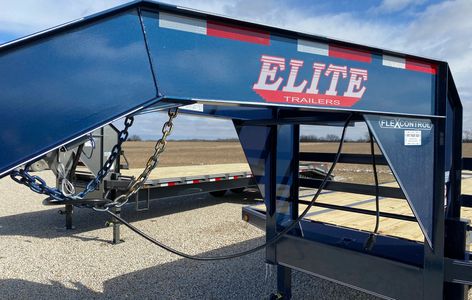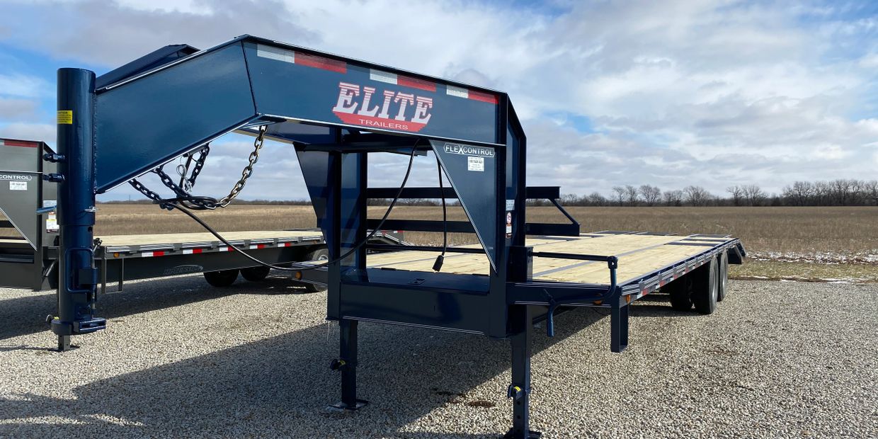 Elite Flatbed....20' with a 5'dovetail, 3 fold over ramps, built in torque tube, dual jacks in the front, covered toolbox between jacks, side step on driver's side, two 7K lb spring axles with brakes on both, LED lights
