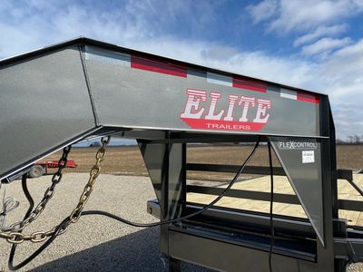 Elite Flatbed...20' with a 5'dovetail, 3 fold over ramps, built in torque tube, dual jacks in the front, covered toolbox between jacks, side step on driver's side, two 7K lb spring axles with brakes on both, LED lights