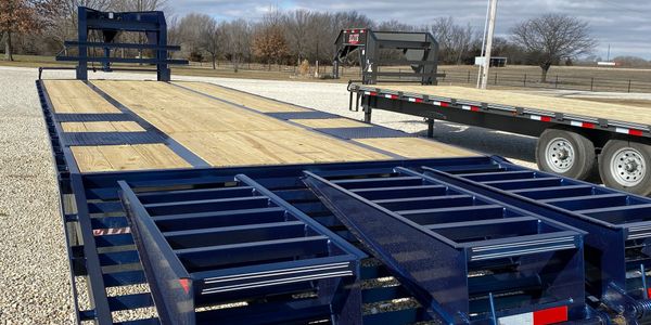32' Elite Tandem Dual Flatbed Midnight Blue ....27' with a 5'dovetail, 3 fold over ramps, two 10K axles with brakes on both, built in torque tube, dual jacks, tool box, side step on drivers side, low profile, LED lights